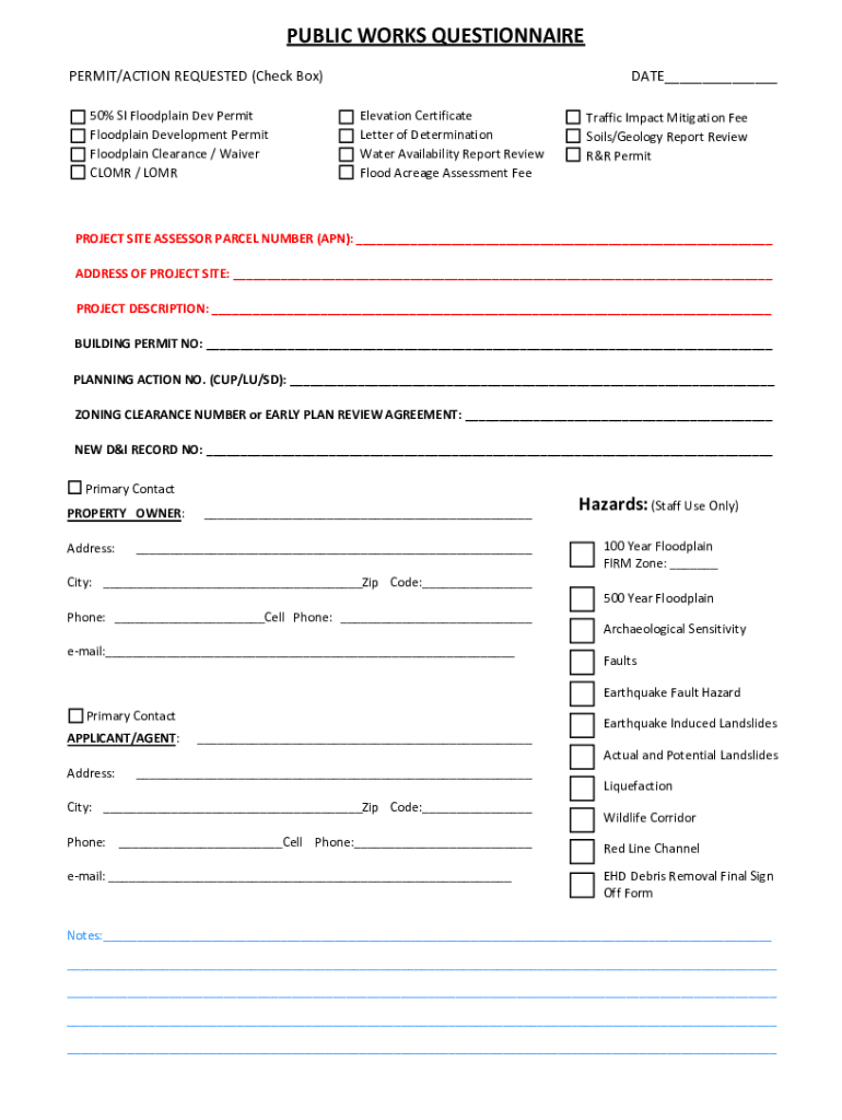 PUBLIC WORKS QUESTIONNAIRE PERMIT/ACTION REQUESTED (Check Box) 50% SI Floodplain Dev Permit Floodplain Development Permit Floodplain Clearance / Waiver CLOMP / DOMINATE___ Elevation Certificate Letter
