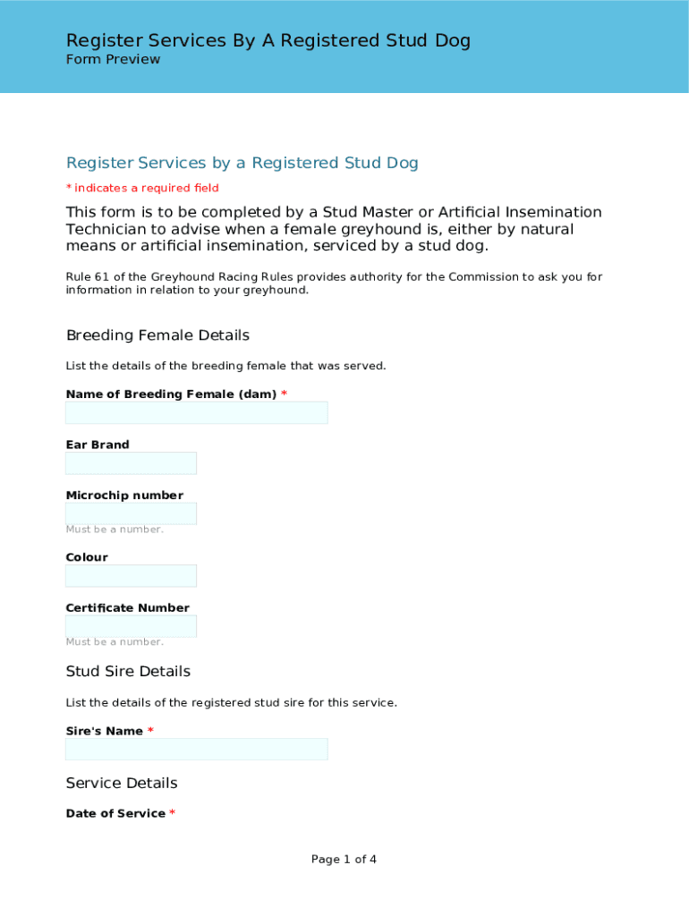 Register Services By A Registered Stud Dog Form PreviewRegister Services by a Registered Stud Dog * indicates a required this form is to be completed by a Stud Master or Artificial Insemination Technician