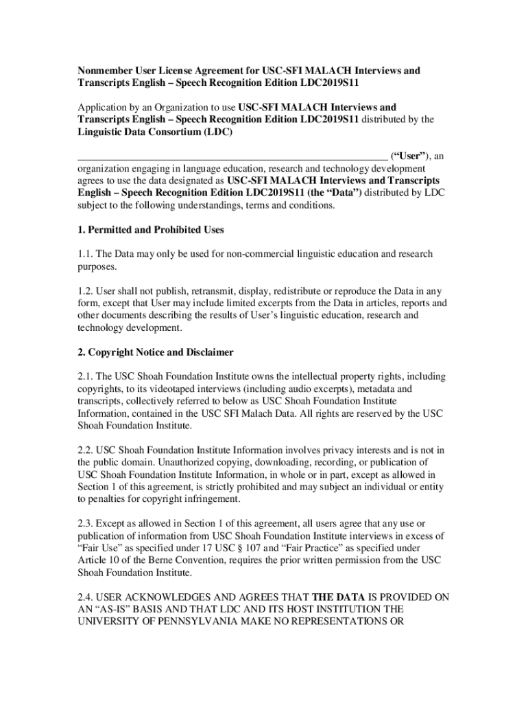 Nonmember User License Agreement for USC SFI MALACHI Interviews and Transcripts English Speech Recognition Edition LDC2019S11 Application by an Organization to use USC SFI MALACHI Interviews and Transcripts