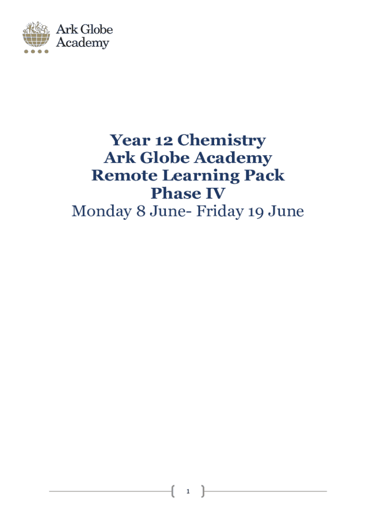 Year 12 Chemistry Ark Globe Academy Remote Learning Pack Phase IV Monday 8 June Friday 19 June1Year 12 Chemistry SessionTitleWork to be completedResource providedOutcomeOnLine Support1Recap of AS