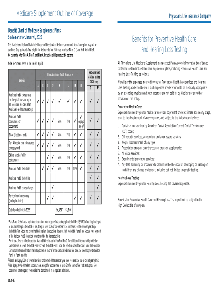 Medicare Supplement Outline of CoveragePhysicians Life Insurance CompanyBenefit Chart of Medicare Supplement PlansBenefits for Preventive Health Care and Hearing Loss Testing Sold on or after January