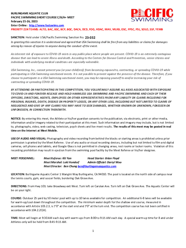 BURLINGTON AQUATIC CLUB PACIFIC SWIMMING SHORT COURSE C/B/A+ MEET February 2526, 2023 Enter Online: http://www.fastswims.com PRIORITY Z1N TEAMS: ALTO, BAC, BSC, BCP, BGC, DACA, DCD, FOG, DAC, MAV,
