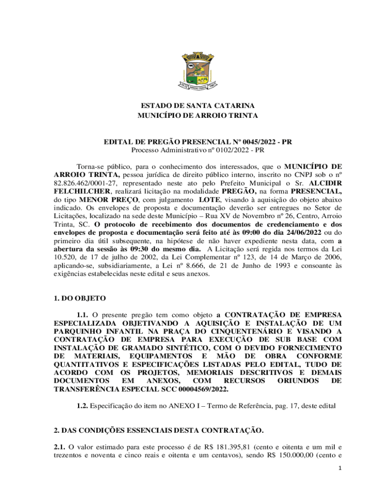 MUNICIPAL DE ARROYO TRINTAEDITAL DE PRESO PRESENCE N 0045/2022 PR