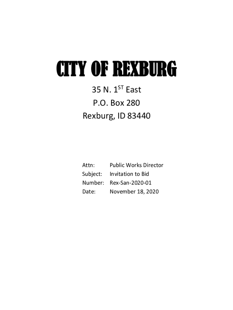 CITY OF REXBURG 35 N. 1ST East P.O. Box 280 Rexburg, ID 83440Attn: Subject: Number: Date:Public Works Director Invitation to Bid RexSan202001 November 18, 2020CITY OF REXBURG Instruction to Bidders