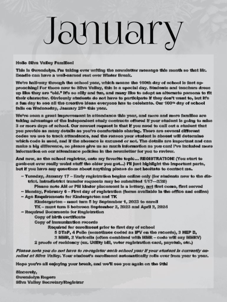 January Hello Silva Valley Families! This is Gwendolyn. I'm taking over writing the newsletter message this month so that Mr. Beadle can have a well-earned rest over Winter Break. We're halfway through