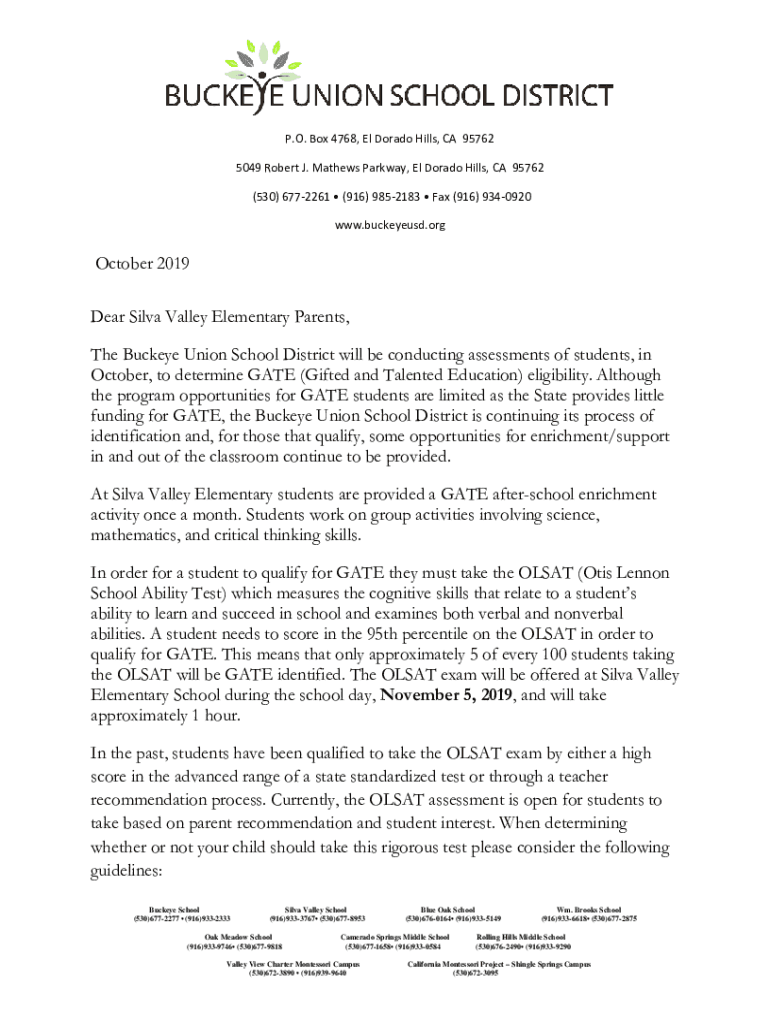 P.O. Box 4768, El Dorado Hills, CA 95762 5049 Robert J. Mathews Parkway, El Dorado Hills, CA 95762 (530) 6772261 (916) 9852183 Fax (916) 9340920 www.buckeyeusd.orgOctober 2019 Dear Silva Valley Elementary