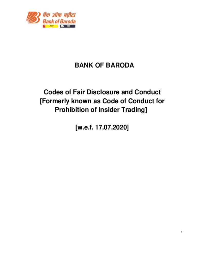 BANK OF Barcodes of Fair Disclosure and Conduct [Formerly known as Code of Conduct for Prohibition of Insider Trading] [w.e.f. 17.07.2020]1INTRODUCTION Necessity for the Code:Insider trading is the