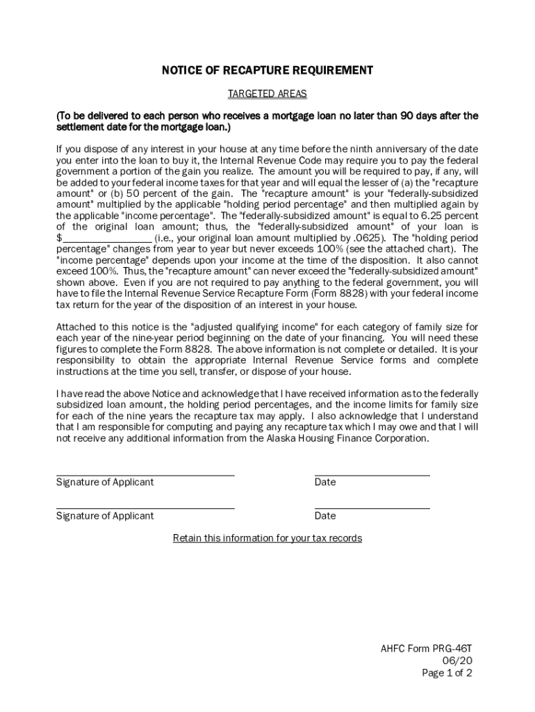 NOTICE OF RECAPTURE REQUIREMENT TARGETED AREAS (To be delivered to each person who receives a mortgage loan no later than 90 days after the settlement date for the mortgage loan.) If you dispose of