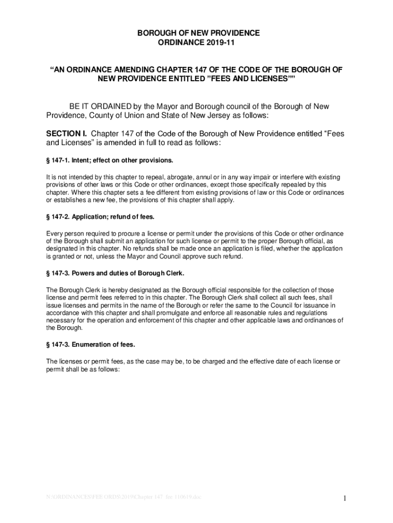 BOROUGH OF NEW PROVIDENCE ORDINANCE 201911 AN ORDINANCE AMENDING CHAPTER 147 OF THE CODE OF THE BOROUGH OF NEW PROVIDENCE ENTITLED FEES AND LICENSES IT ORDAINED by the Mayor and Borough council of
