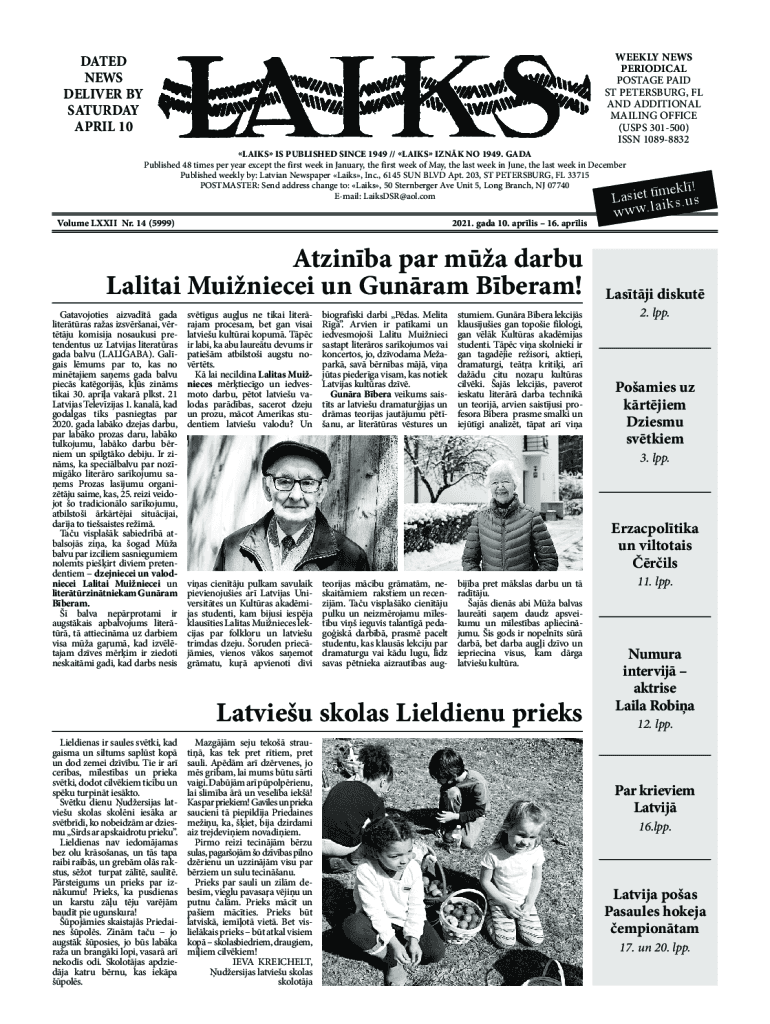 WEEKLY NEWS PERIODICAL POSTAGE PAID ST PETERSBURG, FL AND ADDITIONAL MAILING OFFICE (USPS 301500) ISSN 10898832DATED NEWS DELIVER BY SATURDAY APRIL 10LAIKS IS PUBLISHED SINCE 1949 // LACKS INK NO