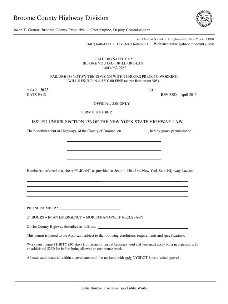 Broome County Highway Work can be filled out by providing detailed information about the work being done, including location, description, and duration.