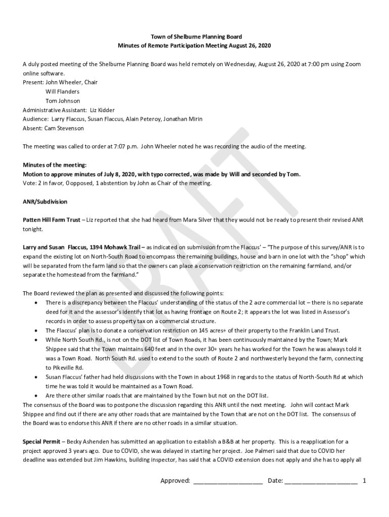 Town of Melbourne Planning Board Minutes of Remote Participation Meeting August 26, 2020, A duly posted meeting of the Melbourne Planning Board was held remotely on Wednesday, August 26, 2020, at