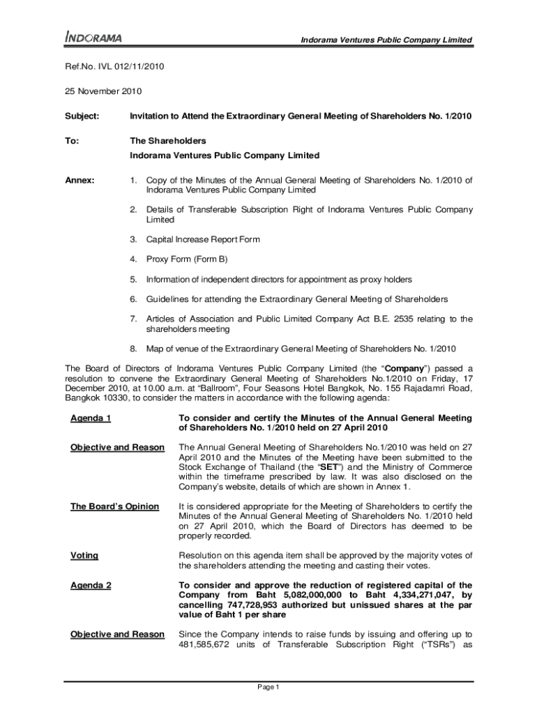 Subject:Invitation to Attend the Extraordinary General Meeting of Shareholders No. 1/2010To:The Shareholders