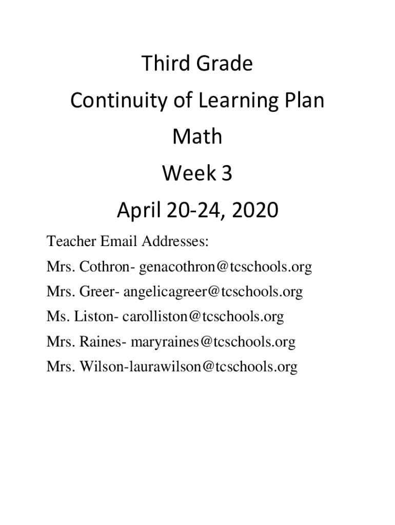 Get the free Third Grade Continuity of Learning Plan Math Week 3 April 20-24 ...