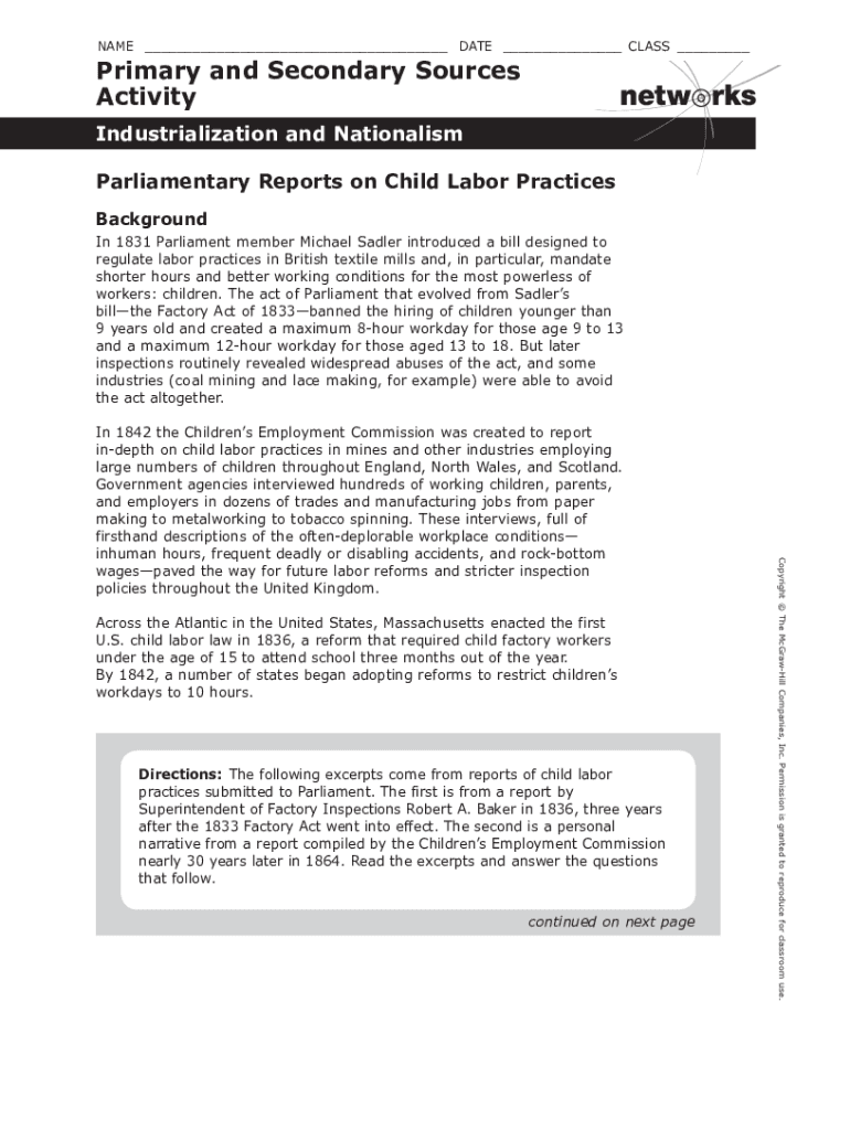 Get the free Primary and Secondary Sources Activity: Parliamentary Reports on ...