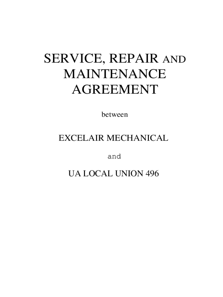 SERVICE, REPAIR AND MAINTENANCE AGREEMENT betweenEXCELAIR MECHANICAL and UA LOCAL UNION 496TABLE OF CONTENTS ARTICLE ONE RECOGNITION .........................................................................................................