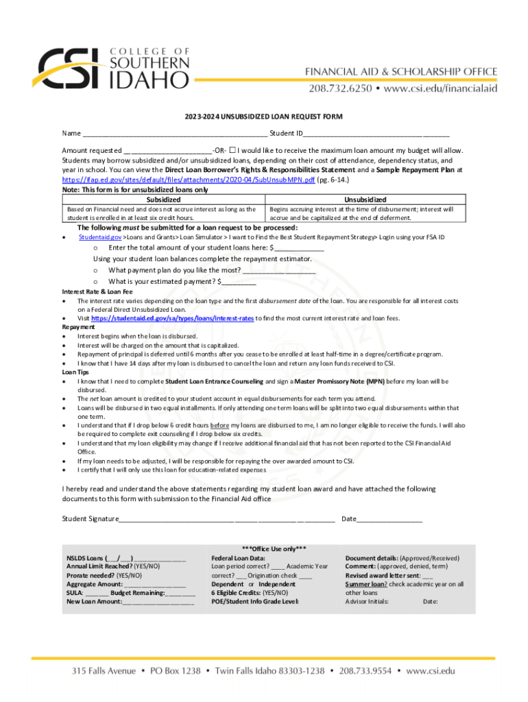 20232024 UNSUBSIDIZED LOAN REQUEST FORM Name ___ Student ID___ Amount requested ___OR I would like to receive the maximum loan amount my budget will allow. Students may borrow subsidized and/or unsubsidized