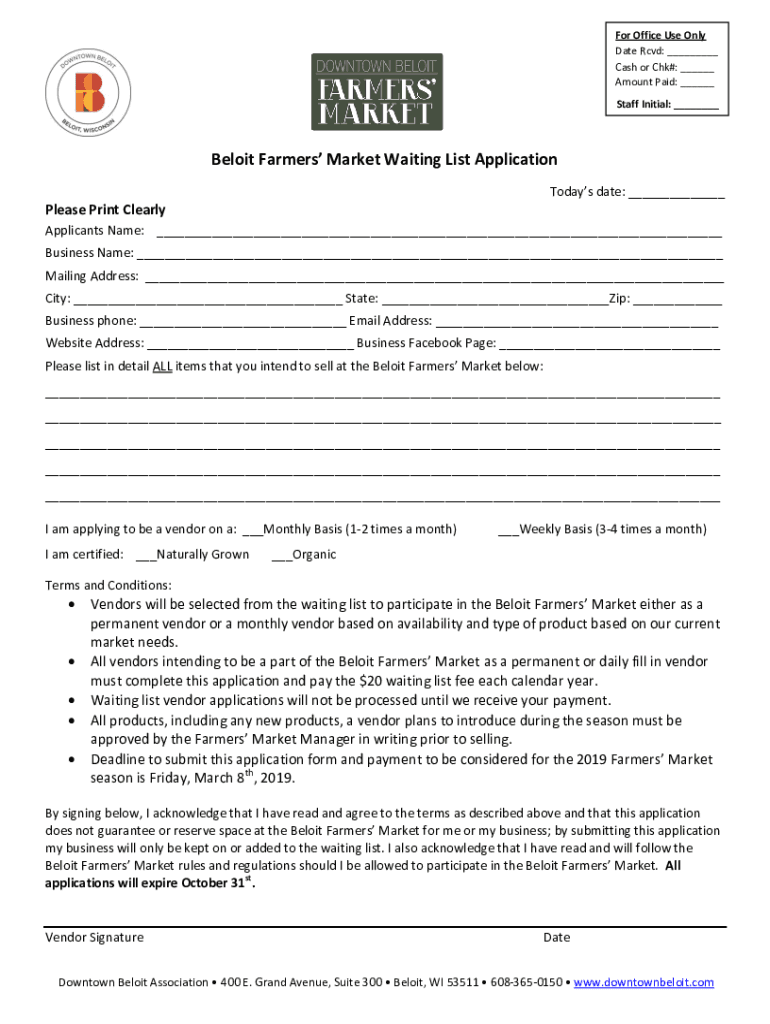 For Office Use Only Date RCD: ___ Cash or CHK#: ___ Amount Paid: ___ Staff Initial: ___Beloit Farmers Market Waiting List Application Today's date: ___Please Print Clearly Applicants Name: ___ Business