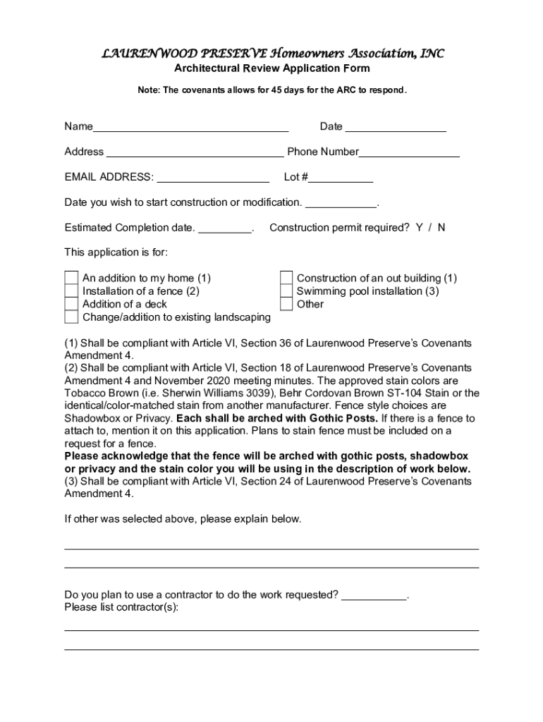 Note: The covenants allows for 45 days for the ARC to respond.Name___Date ___Address ___ Phone Number___