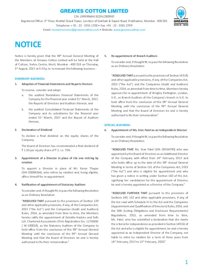 IN: L99999MH1922PLC000987 Registered Office: 3rd Floor, Mozilla Oswald Tower, Junction of Goal & Saying Road, Prabhavati, Mumbai 400 025 Telephone: + 91 22 3355 1700 Fax: +91 22 3381 2799 Email: investorservices@greavescotton.com