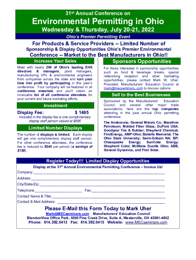 31st Annual Conference environmental Permitting in Ohio Wednesday & Thursday, July 2021, 2022 Ohio's Premier Permitting Eventful Products & Service Providers Limited Number of Sponsorship & Display