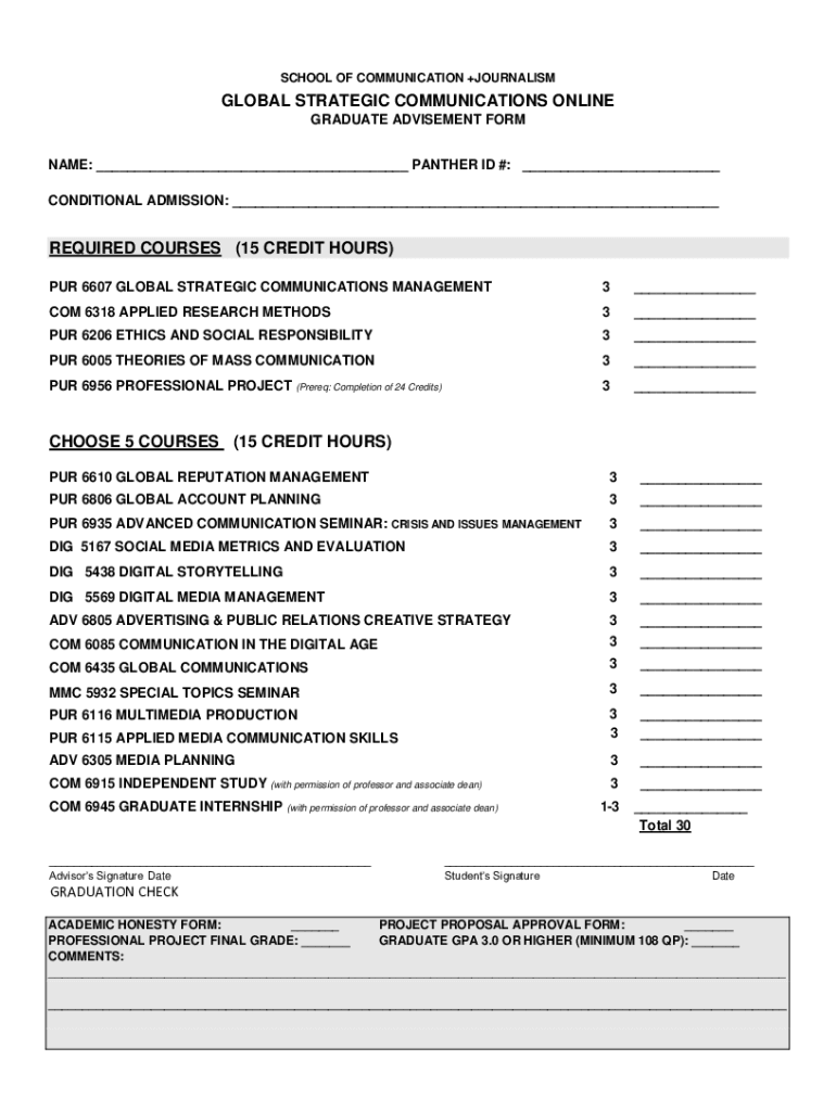 SCHOOL OF COMMUNICATION +JOURNALISMGLOBAL STRATEGIC COMMUNICATIONS ONLINE GRADUATE ADVISEMENT FORM NAME: ___ PANTHER ID #: ___ CONDITIONAL ADMISSION: ___REQUIRED COURSES (15 CREDIT HOURS) PUR 6607