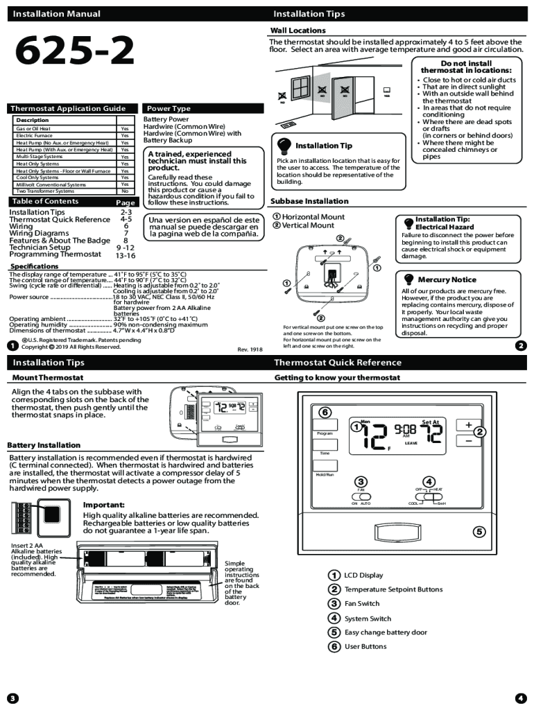 Installation ManualInstallation Tips Wall Locations6252 Thermostat Application Guide Description Gas or Oil Heat Electric Furnace Heat Pump (No Aux. Or Emergency Heat) Heat Pump (With Aux. Or Emergency