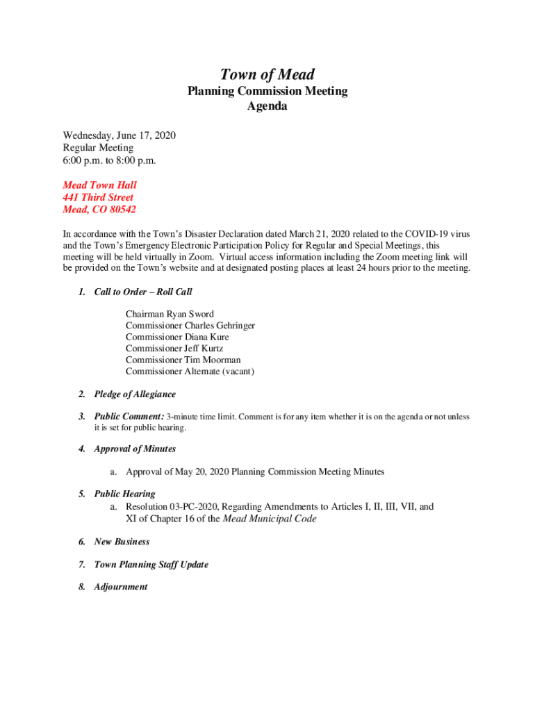 Town of Mead Planning Commission Meeting Agenda Wednesday, June 17, 2020, Regular Meeting 6:00 p.m. to 8:00 p.m. Mead Town Hall 441 Third Street Mead, CO 80542 In accordance with the Towns Disaster