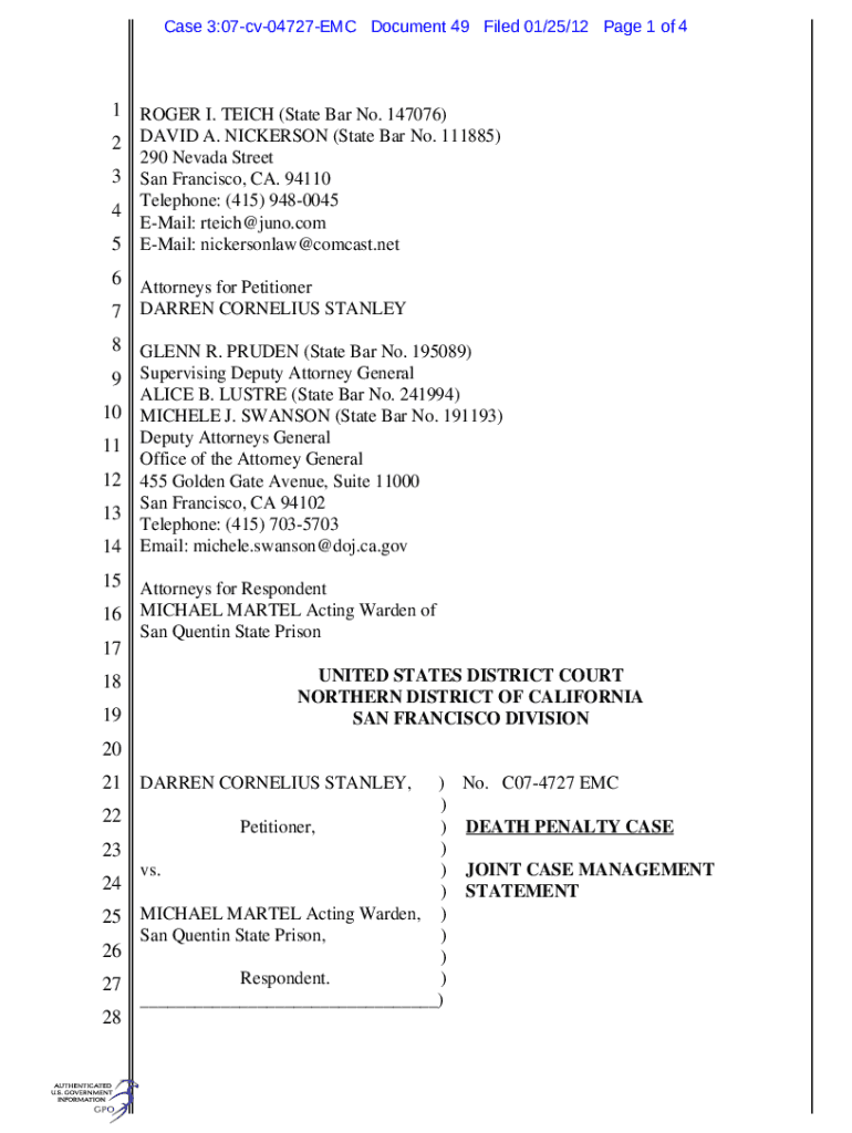 Case 3:07cv04727EMC Document 49 Filed 01/25/12-Page 1 of 41 ROGER I. TEACH (State Bar No. 147076) 2 DAVID A. NICKERSON (State Bar No. 111885) 290 Nevada Street3 San Francisco, CA. 94110 4 5Telephone: