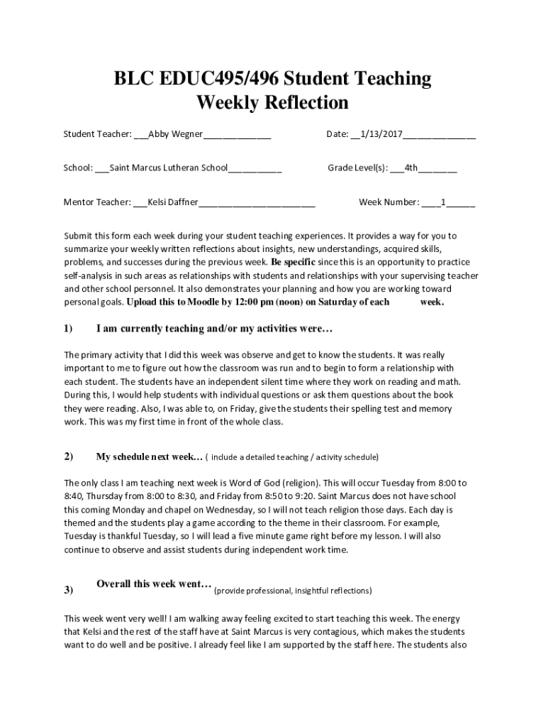 Get the free BLC EDUC495/496 Student Teaching Weekly Reflection