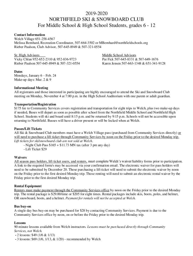 20192020 NORTHFIELD SKI & SNOWBOARD CLUB For Middle School & High School Students, grades 6 12 Contact Information Welch Village 6512584567 Melissa Bernhard, Recreation Coordinator, 5076643502 or