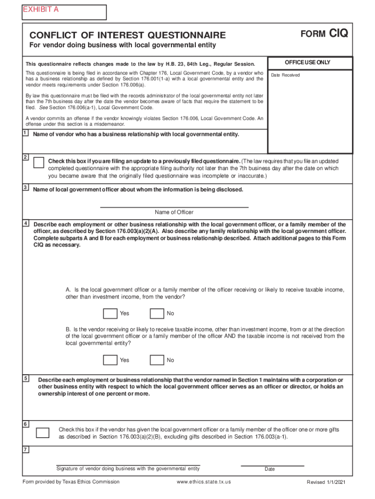 EXHIBIT AFORMCONFLICT OF INTEREST QUESTIONNAIRECIQFor vendor doing business with local governmental entity