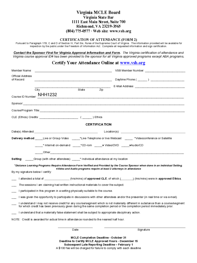Virginia MALE Board Virginia State Bar 1111 East Main Street, Suite 700 Richmond, VA 232193565 (804) 7750577 Website: www.vsb.org CERTIFICATION OF ATTENDANCE (FORM 2) Pursuant to Paragraph 17B, C
