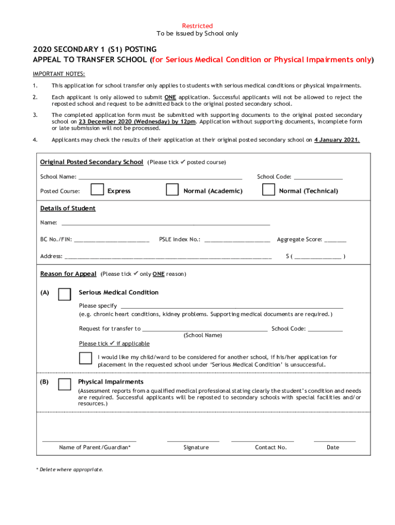 Restricted To be issued by School only2020 SECONDARY 1 (S1) POSTING APPEAL TO TRANSFER SCHOOL (for Serious Medical Condition or Physical Impairments only) IMPORTANT NOTES: 1. This application for