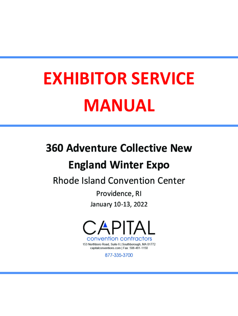 EXHIBITOR SERVICE MANUAL 360 Adventure Collective New England Winter Expo Rhode Island Convention Center Providence, RI January 1013, 2022360 Adventure Collective New England Winter Expo Rhode Island