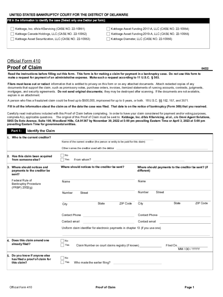 UNITED STATES BANKRUPTCY COURT FOR THE DISTRICT OF DELAWARE Fill in the information to identify the case (Select only one Debtor per form): Cabbage, Inc. d/b/a Servicing (CASE NO. 2210951)Cabbage