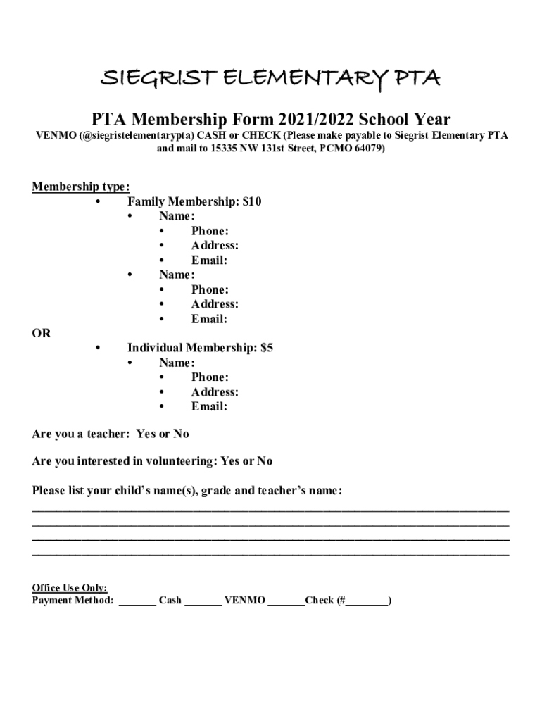 SITARIST ELEMENTARY PTA Membership Form 2021/2022 School Year VENMO (@siegristelementarypta) CASH or CHECK (Please make payable to Sitarist Elementary PTA and mail to 15335 NW 131st Street, PCM 64079)Membership