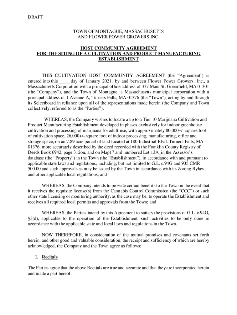 DRAFT TOWN OF MONTAGUE, MASSACHUSETTS AND FLOWER POWER GROWERS INC. HOST COMMUNITY AGREEMENT FOR THE SITING OF A CULTIVATION AND PRODUCT MANUFACTURING ESTABLISHMENTS CULTIVATION HOST COMMUNITY AGREEMENT