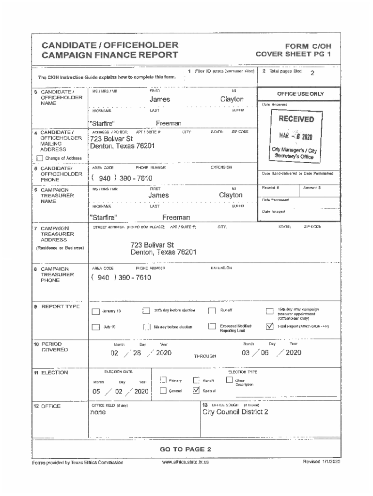 CANDIDATE / OFFICEHOLDER CAMPAIGN FINANCE REPORTER C/OH COVER SHEET PG 1 1FilerID (Ethic Commissioning)2Total pages filed.2The C/Instruction Guide explains how to complete this form.3 CANDIDATE/Lists