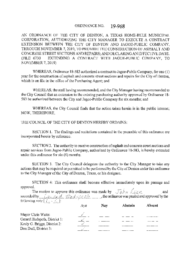 ORDINANCE NO.19 9(an ORDINANCE OF THE CITY OF DENTON, A TEXAS HOME RULE MUNICIPALCORPORATION, AUTHORIZING THE CITY MANAGER TO EXECUTE A CONTRACT EXTENSION BETWEEN THE CITY OF DENTON AND JA GOE PUBLIC