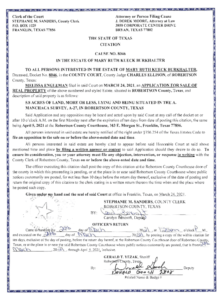 Attorney or Person Filing Cause J. DEREK MOORE, Attorney at Lawler of the Court STEPHANIE M. SANDERS, County Clerk P.O. BOX 1029 FRANKLIN, TEXAS 778563850 CORPORATE CENTER DRIVE BRYAN, TEXAS 77802THE