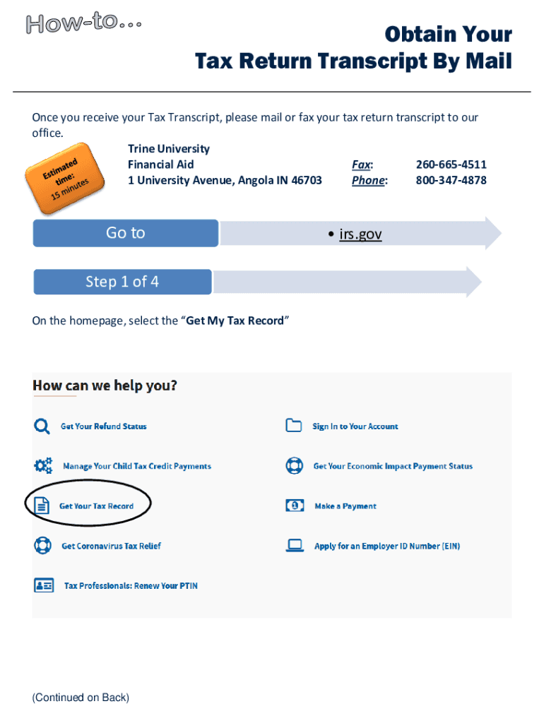 Obtain Your Tax Return Transcript By Mail Once you receive your Tax Transcript, please mail or fax your tax return transcript to our office. Tribe University Financial Aid Fax: 2606654511 1 University