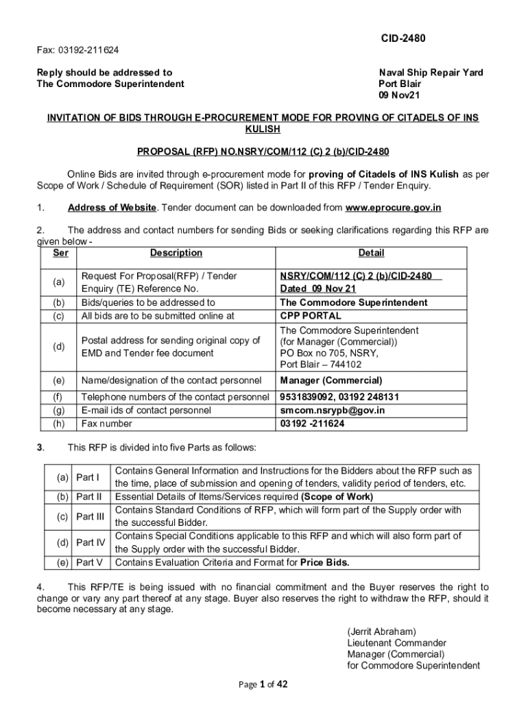 CID2480 Fax: 03192211624 Reply should be addressed to The Commodore SuperintendentNaval Ship Repair Yard Port Blair 09 Nov21INVITATION OF BIDS THROUGH PROCUREMENT MODE FOR PROVING OF CITADELS OF INS