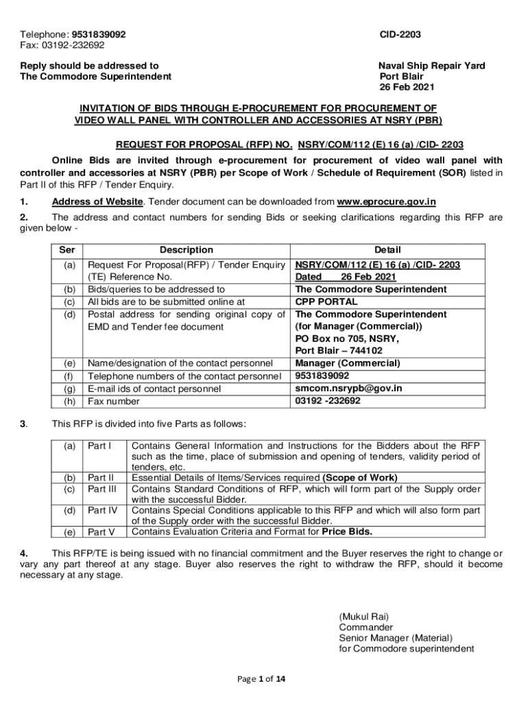 Telephone: 9531839092 Fax: 03192232692CID2203Reply should be addressed to The Commodore SuperintendentNaval Ship Repair Yard Port Blair 26 Feb 2021INVITATION OF BIDS THROUGH PROCUREMENT FOR PROCUREMENT