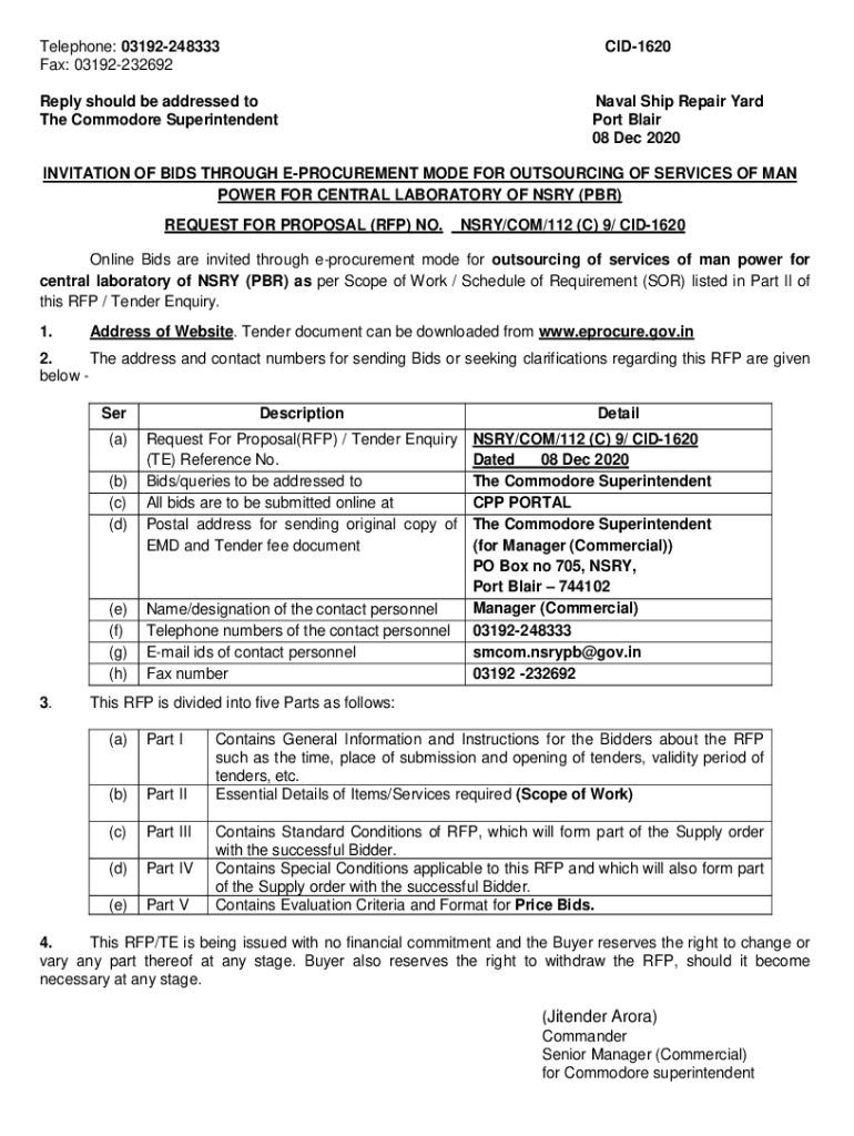 Telephone: 03192248333 Fax: 03192232692CID1620Reply should be addressed to The Commodore SuperintendentNaval Ship Repair Yard Port Blair 08 Dec 2020INVITATION OF BIDS THROUGH PROCUREMENT MODE FOR