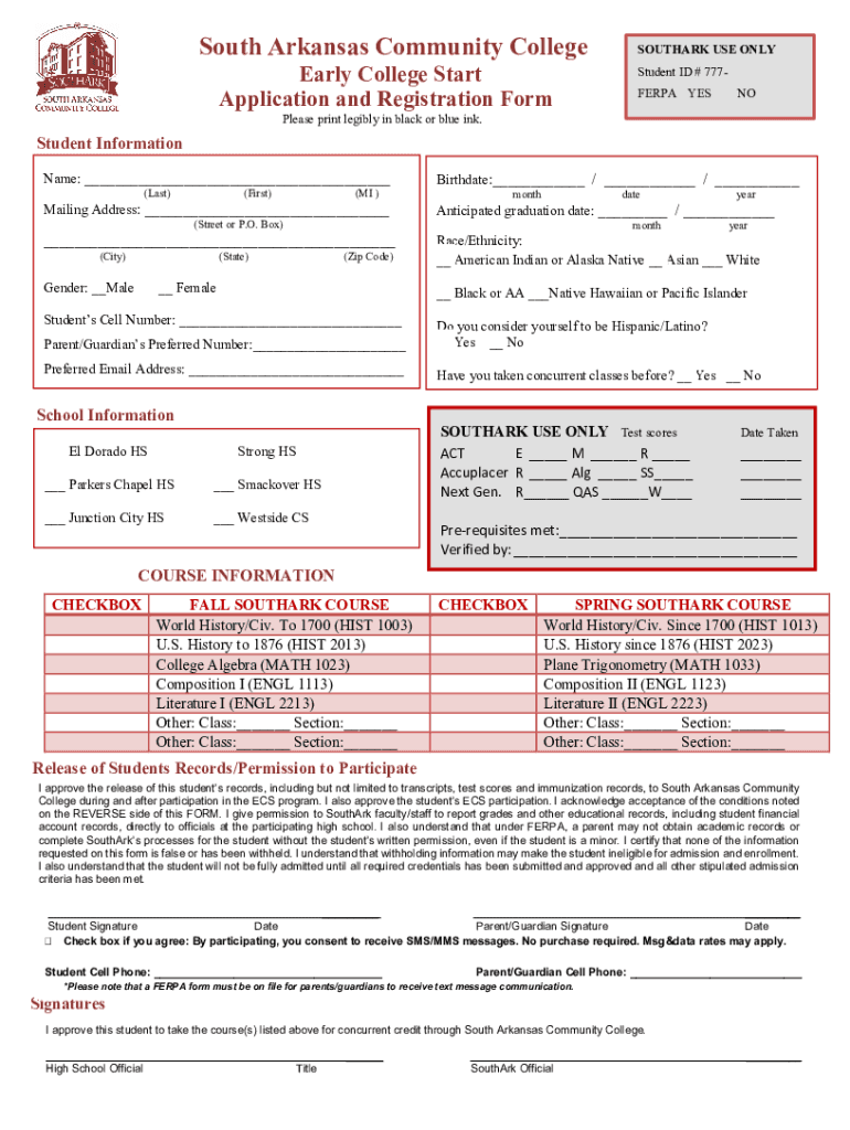 South Arkansas Community College Early College Start Application and Registration FormSOUTHARK USE ONLY Student ID # 777FERPA YESNOPlease print legibly in black or blue ink. Student Information Name: