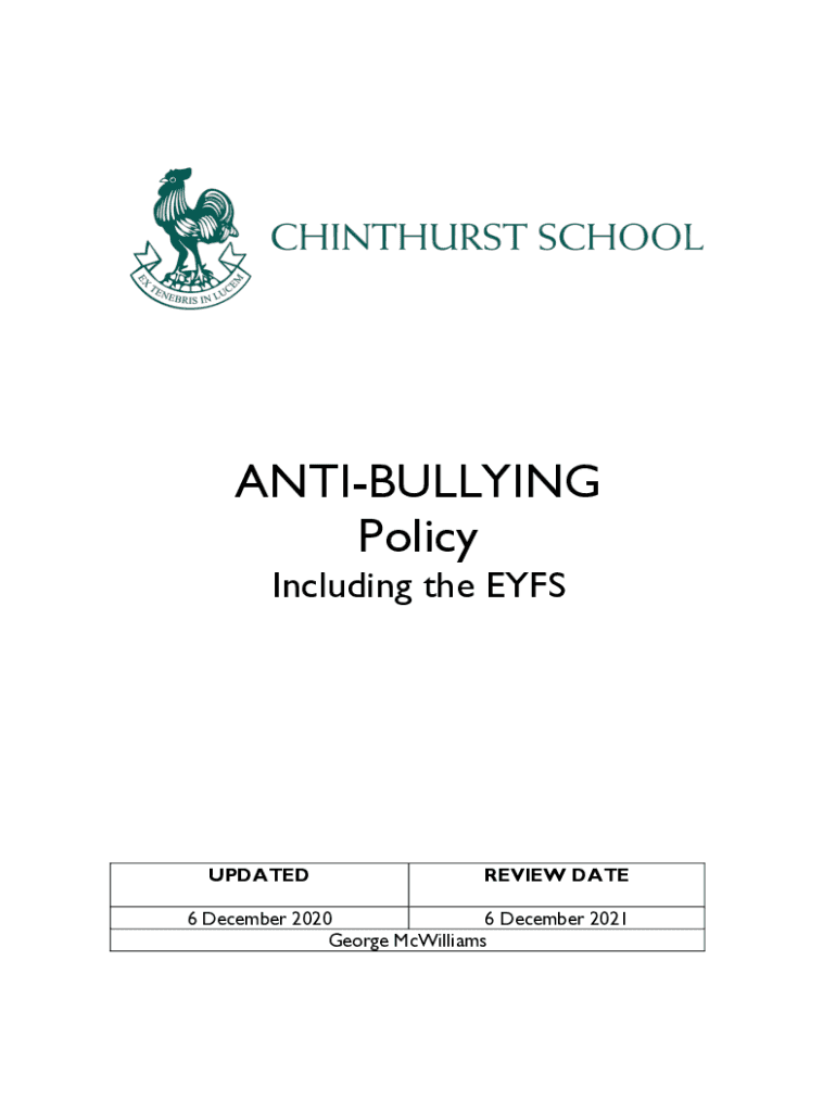 ANTIBULLYING Policy Including the EYFSUPDATEDREVIEW DATE6 December 2020 6 December 2021 George McWilliams1. Behavior by an individual or group usually repeated over time, that intentionally hurts