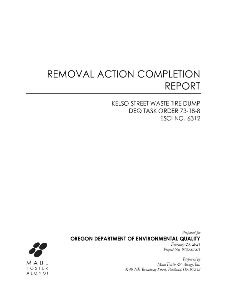 REMOVAL ACTION COMPLETION REPORT KE LSO STREET WASTE TIRE DUMP DEQ TASK ORDER 73188 SCI NO. 6312Prepared Oregon DEPARTMENT OF ENVIRONMENTAL QUALITY February 23, 2021, Project No. 0785.07.01Prepared