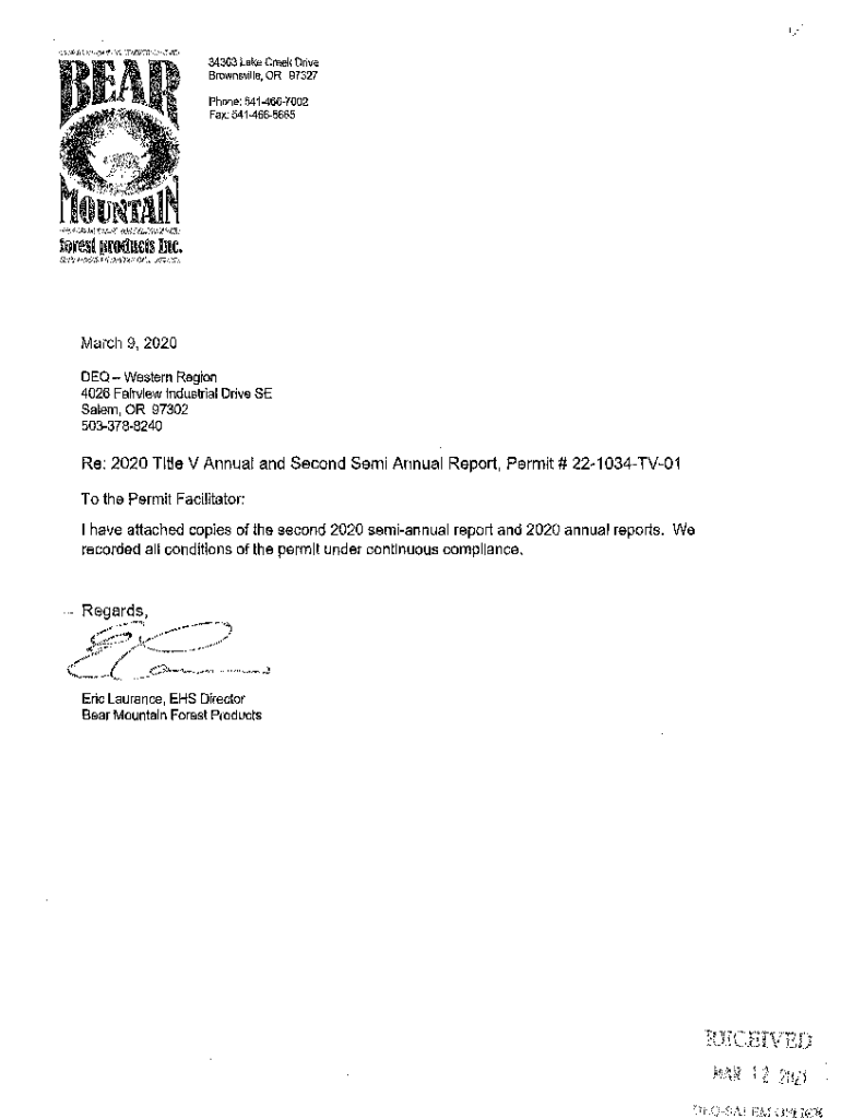 34363 Lake Creek Drive Brownsville, OR 97327 Phone: 5414667002 Fax: 5414665665forest products Inc. \' / /, _\'... ,,,.;;:I.;!, :.\'TY. Z: ft;i: ;:\”. . \', March 9, 2020, DEQ Western Region 4026