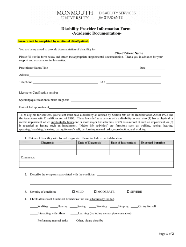 Disability Provider Information Form Academic DocumentationForm cannot be completed by relative of client/patient. You are being asked to provide documentation of disability for:. Client/Patient Name
